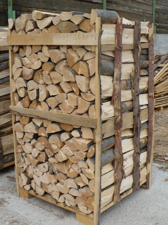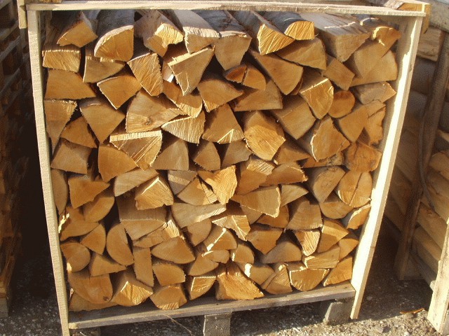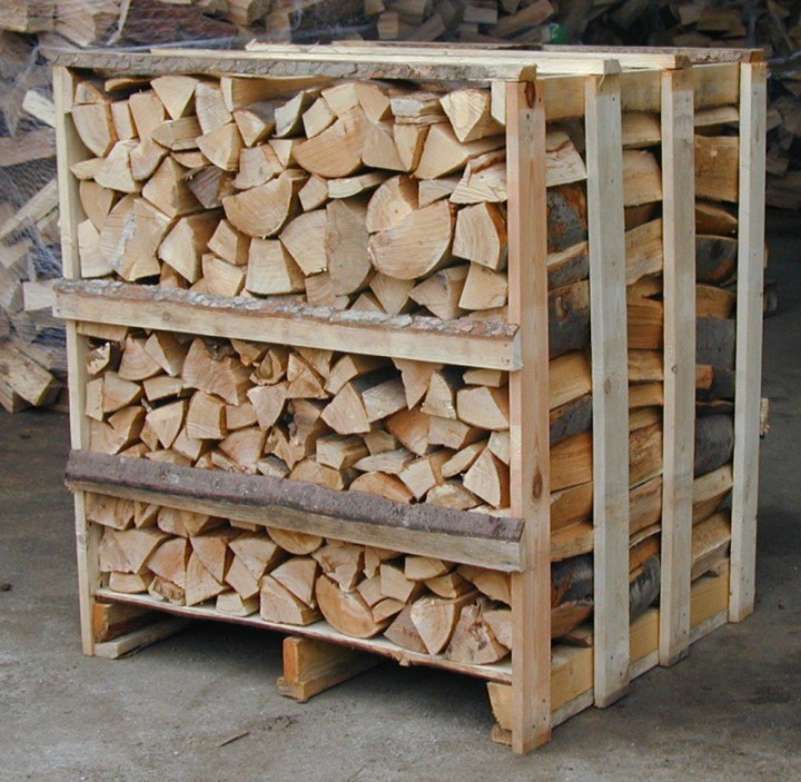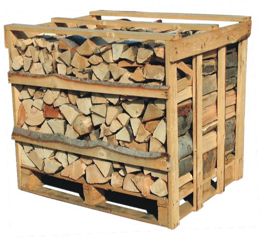 Gespaltenes Brennholz, gelagert in Paletten 1x1x1m ist eine sehr komfortable und kompakte Art und Weise der Holzlagerung. Sie ist vor allem für längere Lagerung geeignet, Möglichkeit der einfachen Verlagerung, z.B. mit Handpalettenwagen, praktische Unterbringung direkt am Heizgerät.